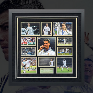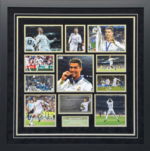 At the heart of the frame is a Beckett-authenticated signature from Ronaldo himself — a rare and valuable addition for any serious football memorabilia collector. Surrounding the signed image are hand-picked highlights from his legendary spell at the Santiago Bernabéu, including Champions League triumphs, jaw-dropping goals, and unforgettable celebrations.